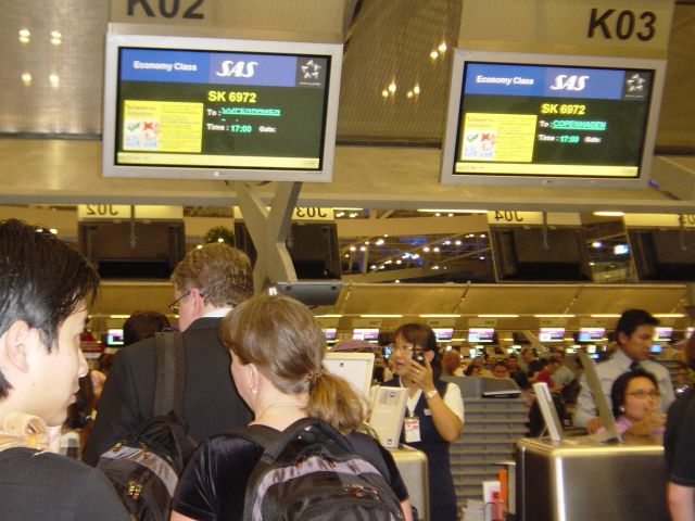 スカンジナビア航空(SK)のカウンターでは、運航を再開したコペンハーゲン行きの臨時便に乗り切れなかった人たちが深夜まで列を作り続け、最終的に会社がノボテルスワンナプームホテルの部屋を確保し乗客を案内させていました。(画像2:今日もコペンハーゲン行きの臨時便に乗れず…)